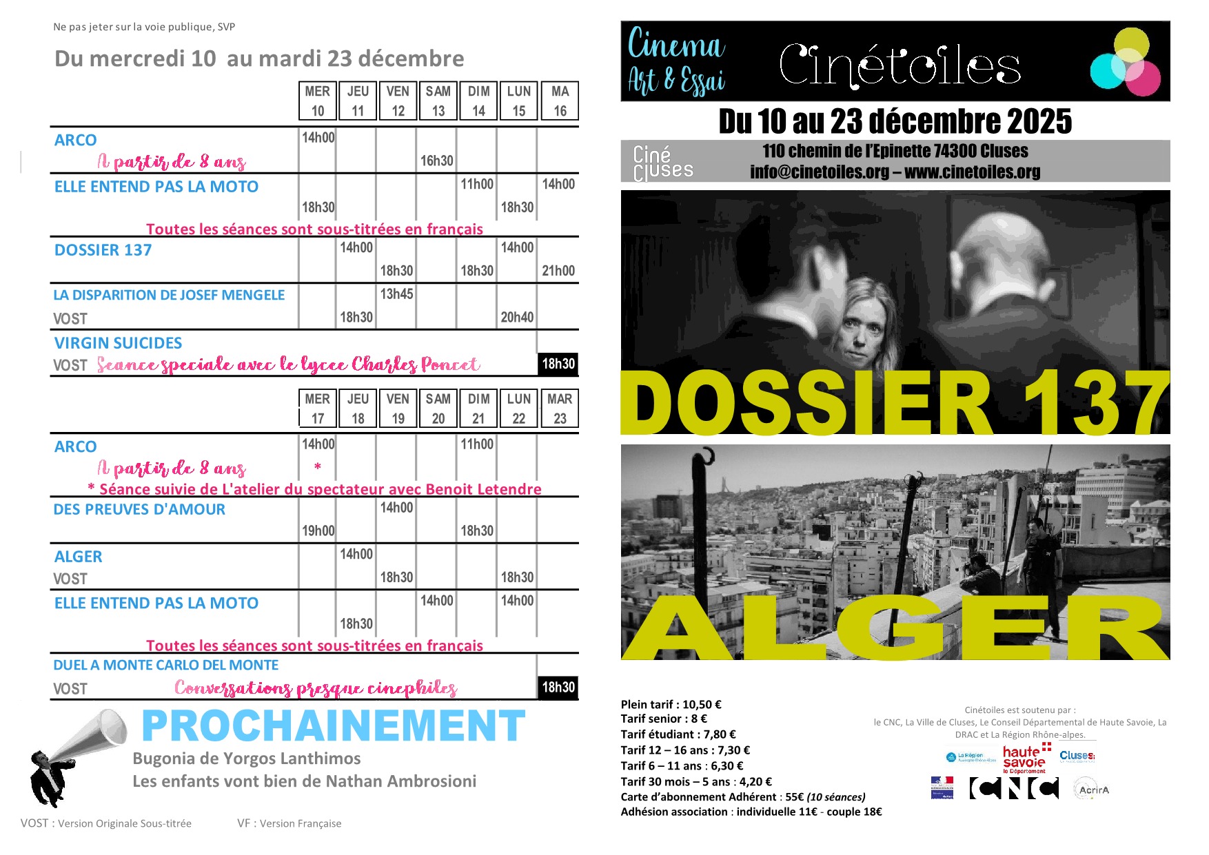 Réservez vos places sur le site :https://www.cinemonde.fr/cluses ou cliquez sur le lien vers CinéCluses pour un accès direct.