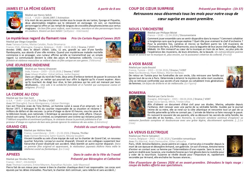 SOUS RÉSERVE DE DISPONIBILITÉ ET DE LA CONFIRMATION DE NOS CHOIX PAR LES CRITIQUES PRESSE ET SPECTATEURS CAR LES FILMS PRESSENTIS SONT SÉLECTIONNÉS AVANT LEUR SORTIE EN SALLE.